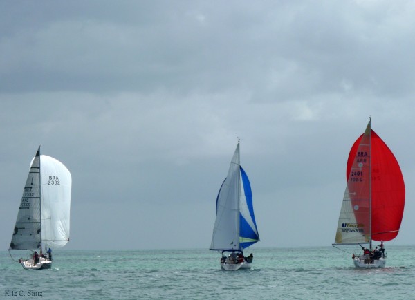 Largamos bem e ficamos um terço da regata na frente do concorrente (nos inscrevemos na ORC Intern 600). Depois de atravessar o barco numa rajada o concorrente abriu uns 5 comprimentos de barco de vantagem. Corremos pra consertar o erro e mantivemos uma distância de 3 barcos até a chegada.